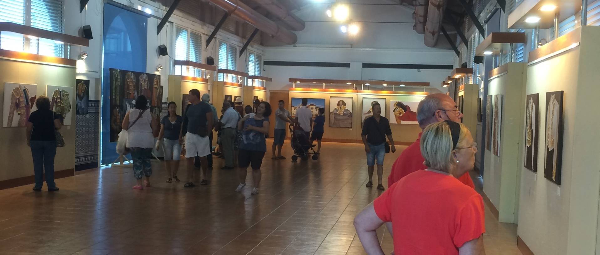 Público asistente en el interior de la sala. Mitad izq. obras de Cristian Reverter, derecha obras de Manuel Franch
